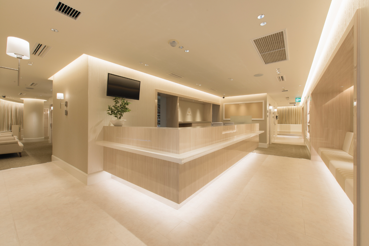 白を基調とした明るい雰囲気の受付。5人の医師と培養士、看護師など総勢85人で治療にあたっています。