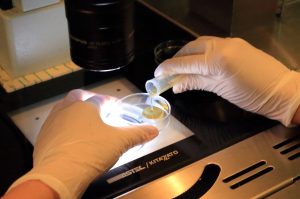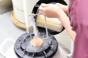 また別の培養士は、クリーンルームで一定期間培養した胚の凍結を行います。胚は専用の凍結液に浸して、患者さんごとの透明チップにのせたうえで液体窒素につけて凍結します。