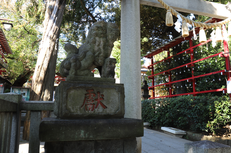 正面鳥居の左側が「子守り犬の狛犬」。子犬の頭をなでると子宝に恵まれるそう。