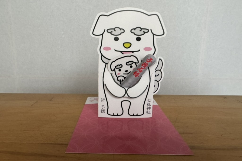 夫婦で身につける子宝の御守は、女性用の「玉鉾(たまほこ)御守」と男性用の「阿福(おふく)御守」があります。「玉鉾御守」には素焼きの男形と稲穂、一粒万倍の紙札を、「阿福御守」には素焼きの女形をそれぞれ御守袋に納めています。ご祈祷のあとは「子守り犬の狛犬(こまいぬ)」や「御神木の銀杏(いちょう)」をなでて、子授けパワーにあやかって。
