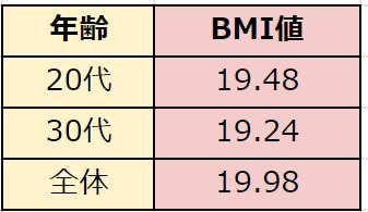 ちなみに、日本人のBMI標準値は、男女ともに22(※)。ということは、今回のアンケート結果は、日本人の平均値よりもやや低め、ということになります。