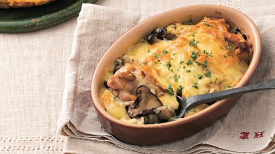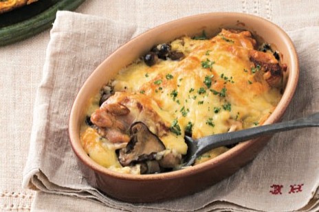 ④グラタン皿に鶏肉、しめじときのこ、①の順に重ね、チーズをかけてトースターで約4分焼き、表面に焼き色をつけ、みじん切りにしたパセリを振る。
