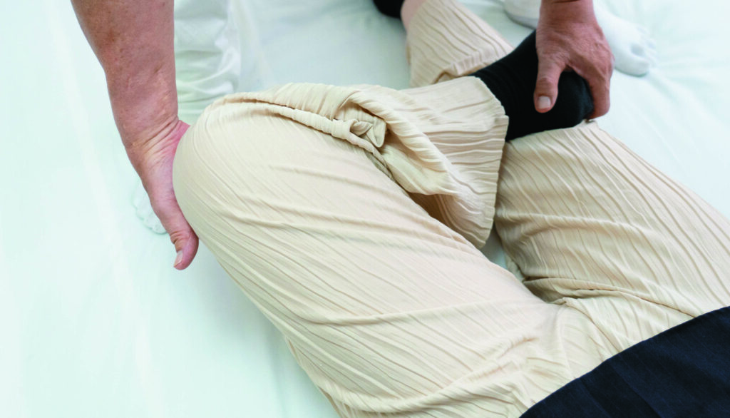 足を4の字のように曲げる「4の字検査®」では、股関節の硬直具合がわかります。