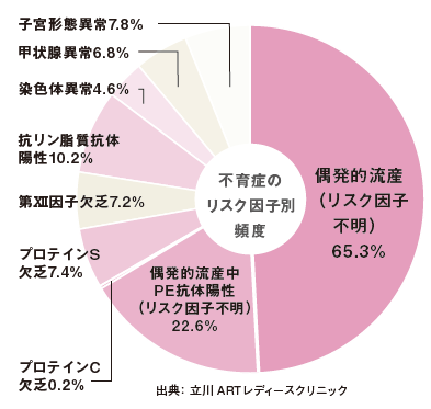不育症の検査を行っても、6割以上の人は明確なリスク因子がわからないため、「異常なし」という診断を、「原因不明」と感じて不安に思うかたも多いようです。しかし、計算上では、流産は2回の場合で64%、3回の場合で51%が赤ちゃんの染色体異常が原因、つまり不幸な偶然なのです。そのため、2回流産した人が何も治療せずに3回目の妊娠で無事出産する確率も約80%と高くなっています。きちんと検査をしたうえで「異常なし」なら、ぜひポジティブな気持ちで次の妊娠をめざしてください。
