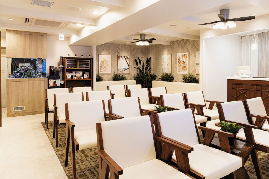 ゆったりくつろげる待合室。海水魚が泳ぐ大きな水槽が出迎えてくれます。
