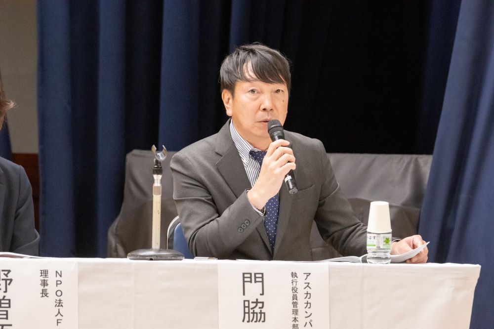 神戸大学の庭本佳子准教授が進行を務め、NPO法人Fine理事長の野曽原誉枝さん、兵庫県加東市に拠点を構えるアスカカンパニー株式会社の門脇弘朋さんが登壇しました。