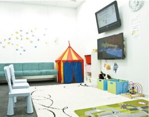 二人目妊活中の人にとって大助かりのキッズルームは、診察室とは別フロアにあります。順番が表示されるモニターもあって安心。